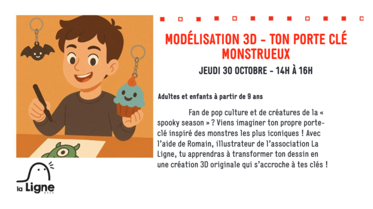 Viens imaginer ton propre porte-clé inspiré des monstres les plus iconiques ! Avec l’aide de Romain, illustrateur de l’association La Ligne, tu apprendras à transformer ton dessin en une création 3D originale qui s’accroche à tes clés !